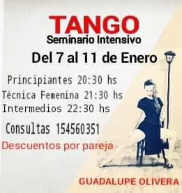 Sobre el nivel intermedio, la bailarina indicó que “el mismo tendrá lugar a partir de las 22:30, está destinado para aquellos que ya tienen conocimientos previos, en este nivel se trabajará intensamente sobre el análisis y la técnica de la caminata, el abrazo, la conexión de la pareja, figuras como sacadas, enroques, paradas, lápiz, dinámicas análisis de musicalidad, estructura musical, introducción, adagio, variación, pausas, matices, sin compás, entre otros”.