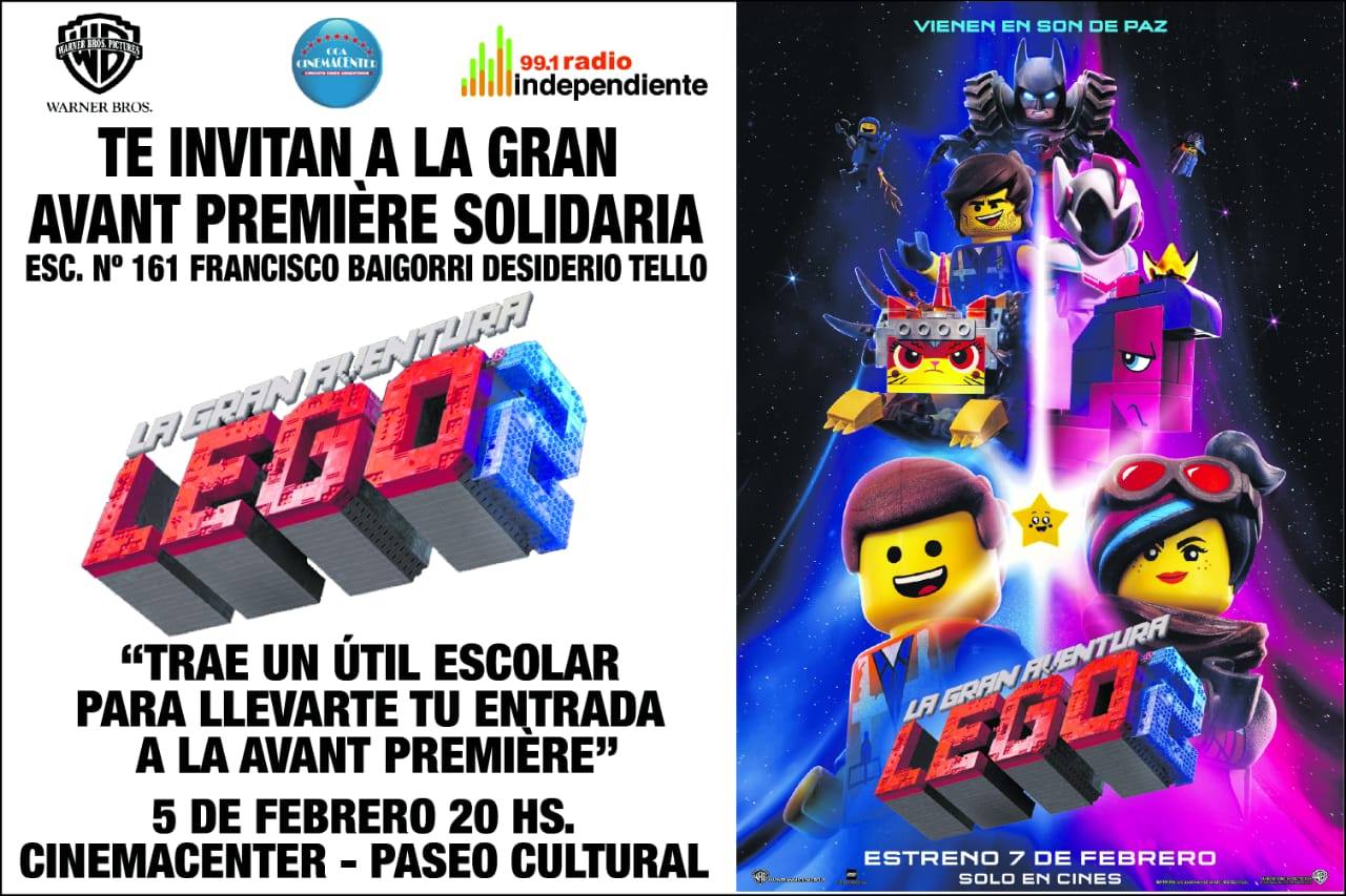 Cinemacenter y Medios El Independiente invitan al estreno de la película La gran aventura Lego 2. En una función solidaria este martes 5 de febrero a las 20 horas, la entrada consistirá en útiles escolares que serán donados a la Escuela N° 161 Francisco Baigorri de Desiderio Tello..