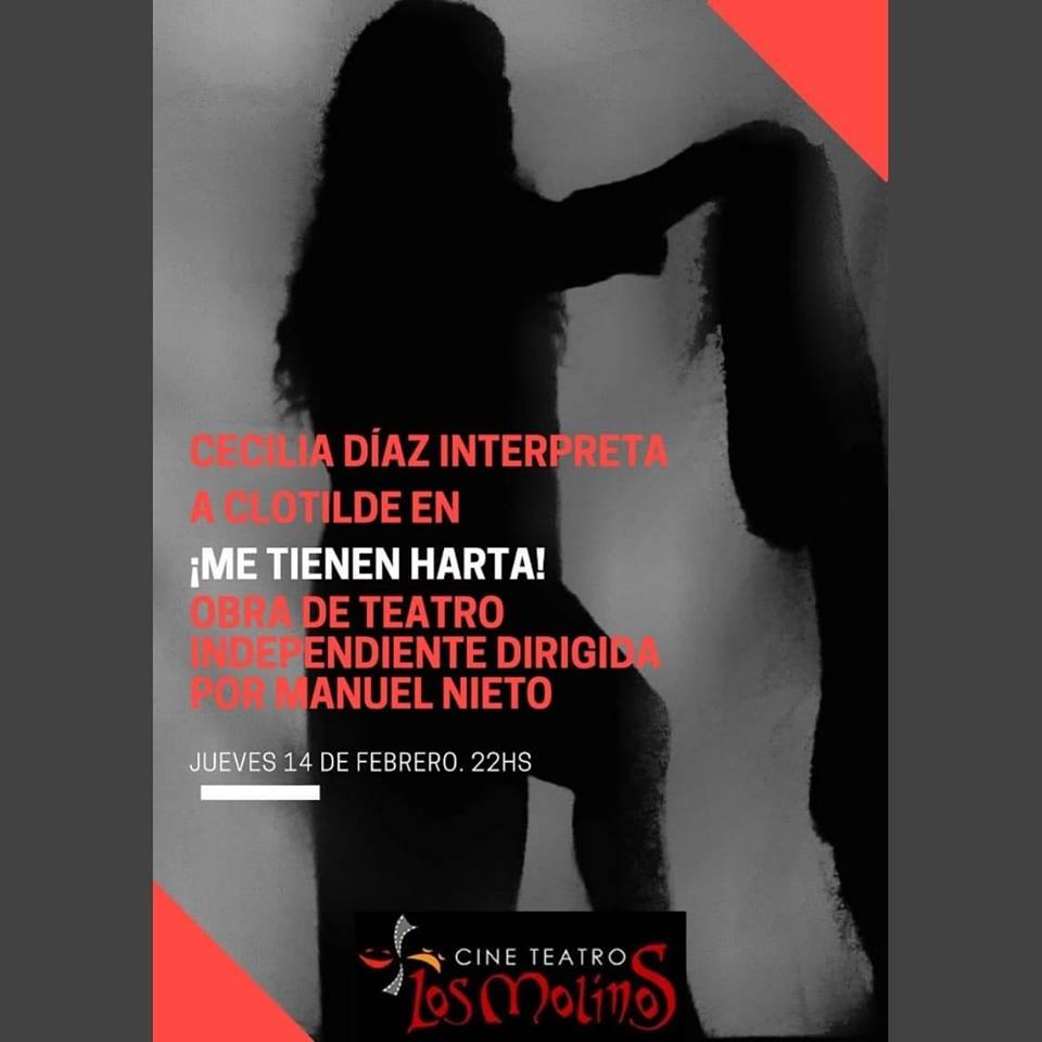 El jueves 14 de febrero desde las 22 horas en el Cine Teatro de Los Molinos subirá a escena la propuesta teatral independiente "Me tienen harta" con la actuación de Cecilia Diaz y la dirección de Manuel Nieto..