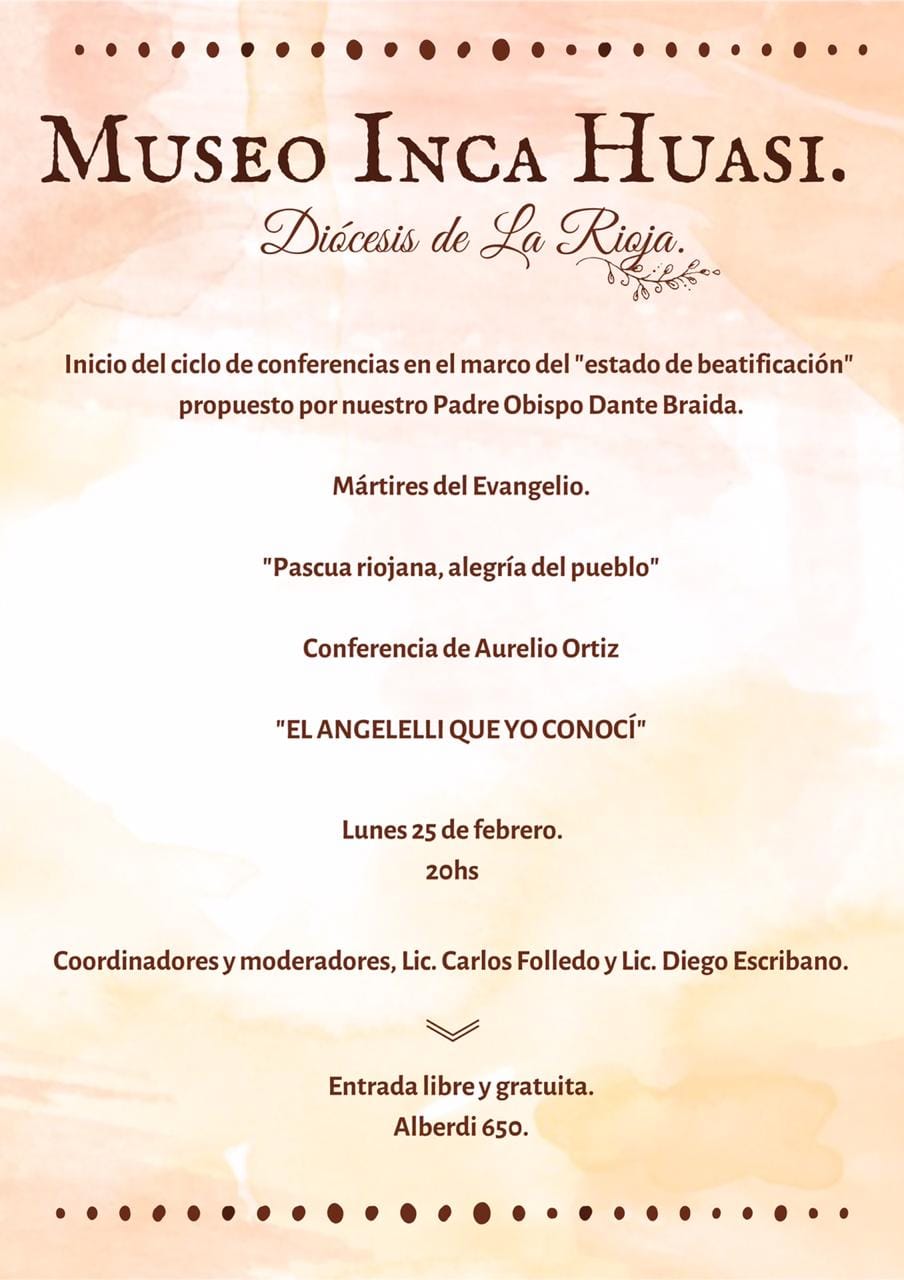 El Museo Inca Huasi y la Diócesis de La Rioja inician un ciclo de conferencias en el marco del estado de beatificación propuesto por el obispo Dante Braida. La primera actividad será el lunes 25 de febrero a las 20 con Alilo Ortiz que abordará El Angelelli que yo conocí en el museo ubicado en Alberdi 650..