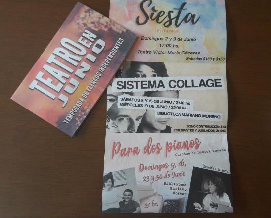 Tres grupos de teatro decidieron juntarse y programar sus obras para todo el mes de junio. Se trata de tres propuestas diferentes, atractivas y originales: Siesta, Sistema Collage y Para dos Pianos - cuentos de Daniel Moyano. Se presentarán en el Teatro Provincial Víctor María Cáceres y en la Biblioteca Mariano Moreno.