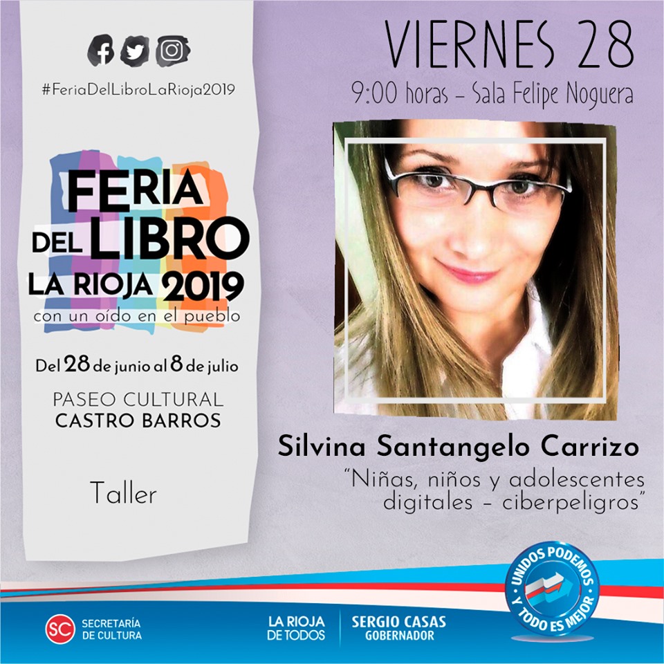 Sala Felipe Noguera, 9:00, “Niñas y niños digitales-ciber peligros”, taller a cargo de Silvia Santangelo Carrizo.