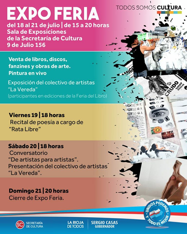 La Secretaría de Cultura a través de la coordinación de Artes Visuales, organiza una Expo Feria que se realizará del 18 al 21 de julio en la Sala de Exposiciones de la Secretaría de Cultura, ubicada en calle 9 de Julio 156.