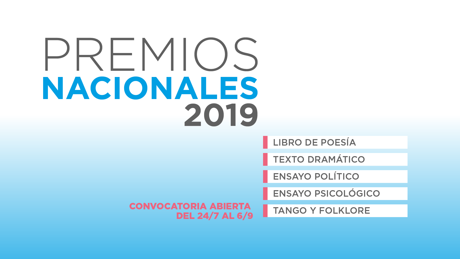 Hasta el 6 de septiembre la Secretaría de Cultura de la Nación mantiene abierta la convocatoria para participar de los Premios Nacionales 2019. En esta oportunidad, concursarán las primeras ediciones de obras publicadas y/o estrenadas durante el período 2015-2018 sin excepción..