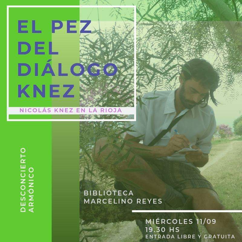 Nicolás Knez visita La Rioja para difundir su libro El pez del diálogo Knez, una pequeña fábula que apuesta al desconcierto armónico a través un mensaje de conexión con la naturaleza y empatía entre las personas. Desde hace meses el autor distribuye su obra de forma gratuita, lo que también hará este miércoles, desde las 19.30, junto a semillas y plantines, en la Biblioteca Marcelino Reyes.