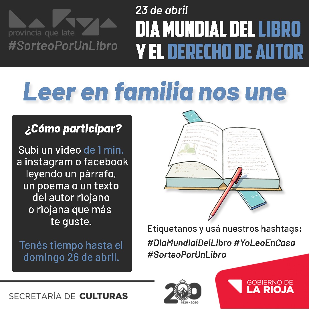 “¡Leer en familia nos une!” es una de las propuestas; un sorteo en donde participas para ganar un libro de la Tienda de Libros Todo Cultura. Este consiste en compartir en tus redes sociales (facebook e instagram) una publicación con un vídeo de no más de un minuto leyendo un párrafo, poema o extracto a elección de un autor o autora de La Rioja hasta el 26 de abril a las 18 horas. Puede participar toda la familia, niños, niñas, adolescentes, adultos y adultos mayores. Este video debe ser compartido utilizando los hashtags #DíaInternacionalDelLibro #YoLeoDesdeCasa #SorteoPorUnLibro #QuedateEnCasa. En el caso de que el ganador sea del interior provincial, se le enviará su premio.