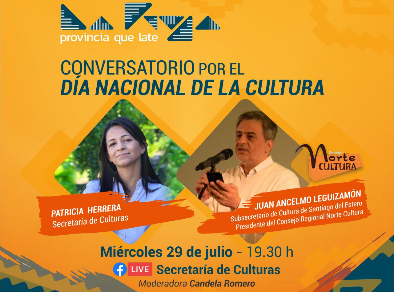 Esta tarde a las 19:30 horas, a través de Facebook Live desde la cuenta Secretaría de Culturas, realizaremos un conversatorio virtual con la secretaria de Culturas de La Rioja, Patricia Herrera; y el actual presidente del Consejo Regional Norte Cultura, Juan Anselmo Leguizamón.
