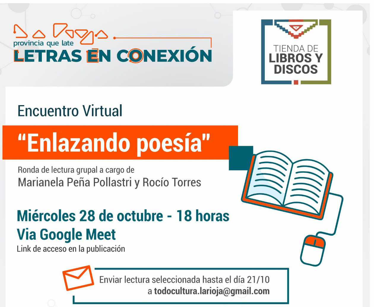 En el marco del programa Letras en Conexión, la Secretaría de Culturas a través de su Tienda de Libros y Discos, invita a todos y todas a participar del encuentro virtual Enlazando poesía, el miércoles 28 de octubre a las 18 horas por Google Meet.