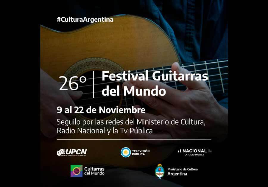 El Ministerio de Cultura de la Nación, desde la Secretaría de Gestión Cultural, con el apoyo de UPCN, Radio Nacional y la TV Pública, realizarán la 26° edición del Festival Internacional Guitarras del Mundo. Los conciertos se transmitirán a las 19 h, vía Facebook y YouTube del Ministerio de Cultura, desde el 9 al 15 de noviembre, y del 15 al 22 por Radio Nacional y la TV Pública.