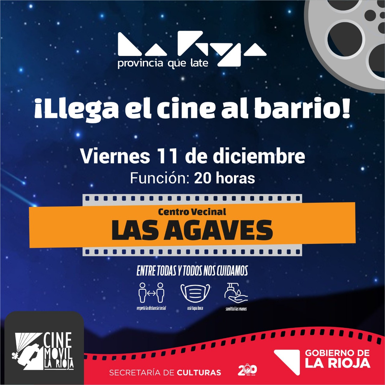 Las próximas proyecciones del cine móvil serán, a las 20 horas, los días: 10 de diciembre: barrio Yacampis, 11 de diciembre: barrio Las Ágaves, 12 de diciembre: barrio 13 de enero, 13 de diciembre: barrio San Vicente, 18 de diciembre: barrio Juan Melis, 19 de diciembre: barrio San Clemente.
