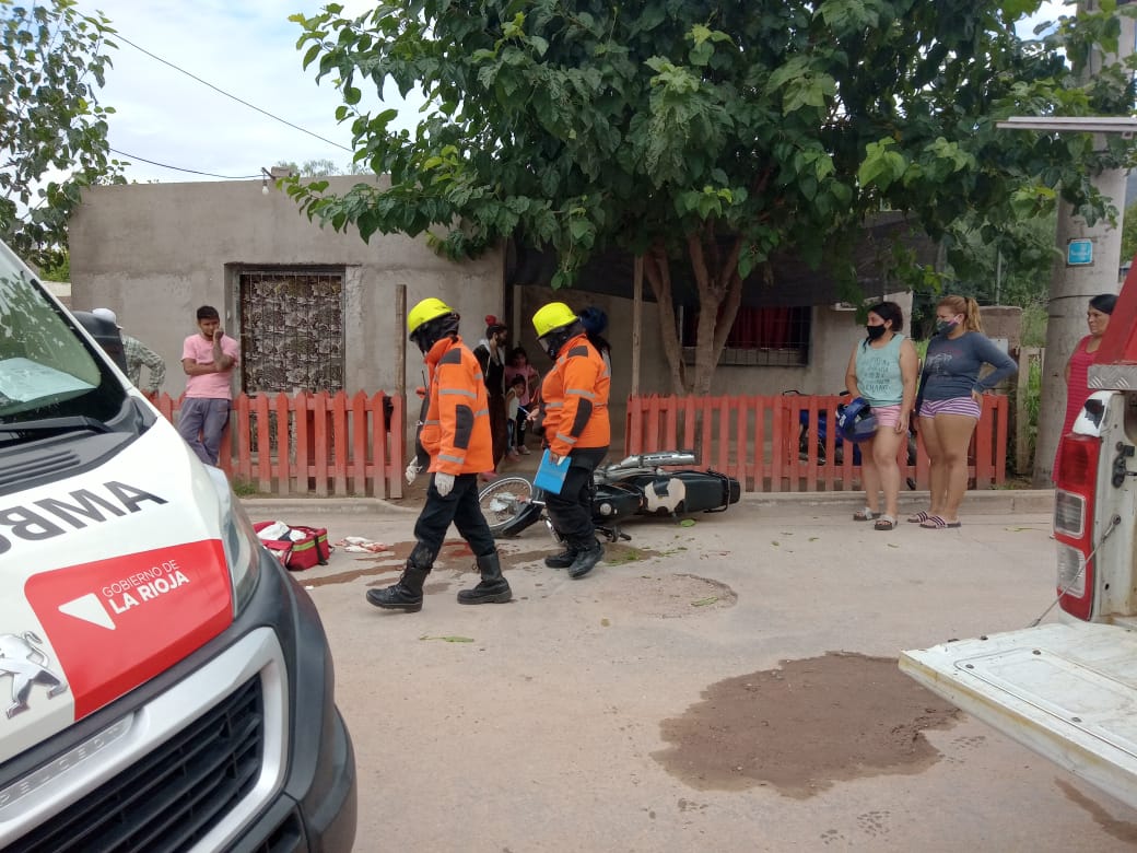 El motociclista identificado como Pablo Nicolás Trujillo, de 39 años, con domicilio en el barrio Joya del Velazco sufrió traumatismo en el miembro inferior derecho con herida cortante profunda.