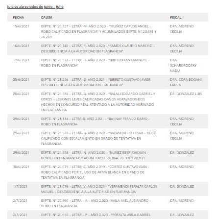 Con la convicción de que la sociedad tiene el derecho de acceder a la información oficial sobre los delitos que se registran dentro de la modalidad de Flagrancia, se informó que durante las últimas dos semanas se realizaron 12 juicios abreviados y 6 elevaciones a juicio, a saber: (Ver foto).