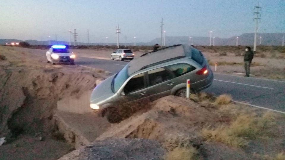 El hecho se produjo en la mañana de este lunes en la localidad de Aimogasta en donde un conductor perdió el control del rodado, debido a un desperfecto en uno de sus neumáticos, el cual se reventó, saliendo de la cinta asfáltica para quedar el vehículo arriba y suspendido de una alcantarilla.