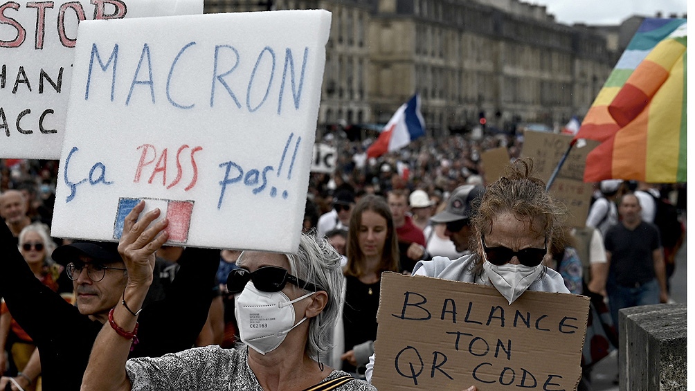 Buena parte de los manifestantes, algunos vacunados, ven en esta imposición del pase sanitario una "obligación camuflada para vacunarse" y "una sociedad de control", y temen que los empleadores puedan suspender temporalmente el contrato de un trabajador si este no tiene el pase en regla.