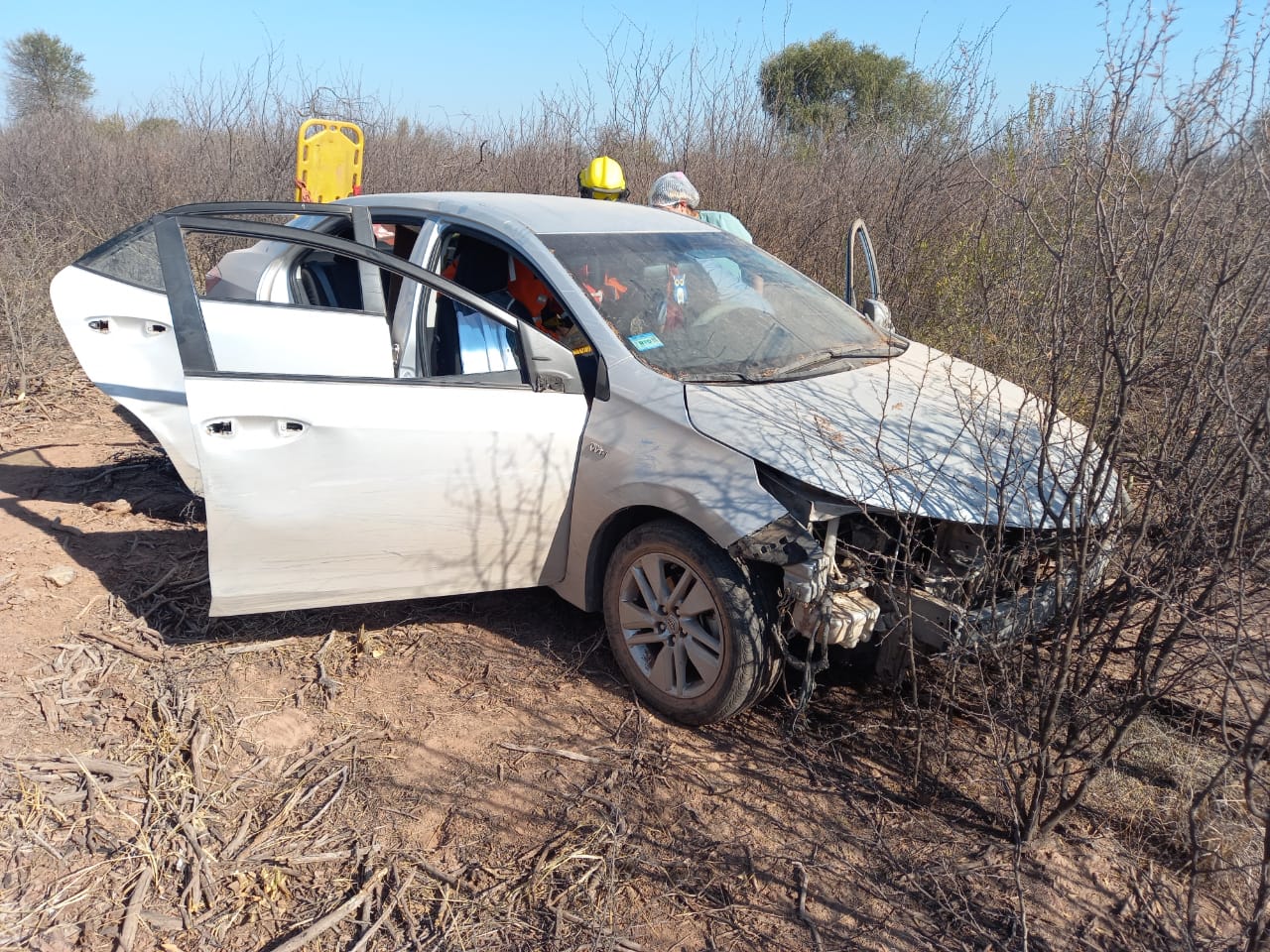 Trabajó Bomberos Voluntarios Águilas de Acero conjuntamente con el Servicio 107, base 2, a cargo de la Dra. Canachi, realizando la extracción de la señora Fuentes, que se encontraba dentro del vehículo, para luego ser trasladada al Hospital Vera Barros.