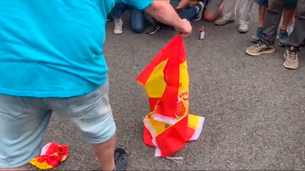 En las imágenes difundidas por el periodista Marc González se puede ver a un grupo de manifestantes y fotógrafos alrededor de un hombre que prende fuego las banderas del Estado Español.