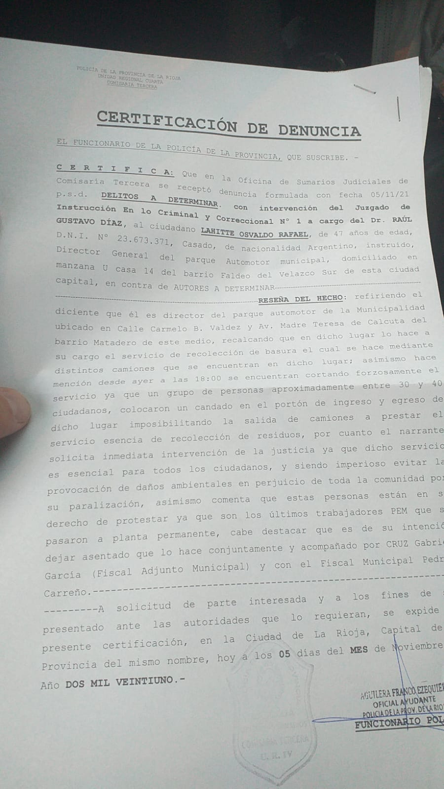 Ante el bloqueo que se sostiene en el Parque Automotor, por parte de un grupo de personas, motorizadas por el sector del Gobierno Provincial, que impiden la salida de los camiones recolectores de residuos, con la clara intención de generar un daño ambiental en la ciudad, la Municipalidad de la Capital, a través del director del Parque Automotor, Osvaldo Lahite, se presentó denuncia policial en la Comisaría Tercera, solicitando asistencia a la policía de la provincia, para despejar el ingreso del predio.