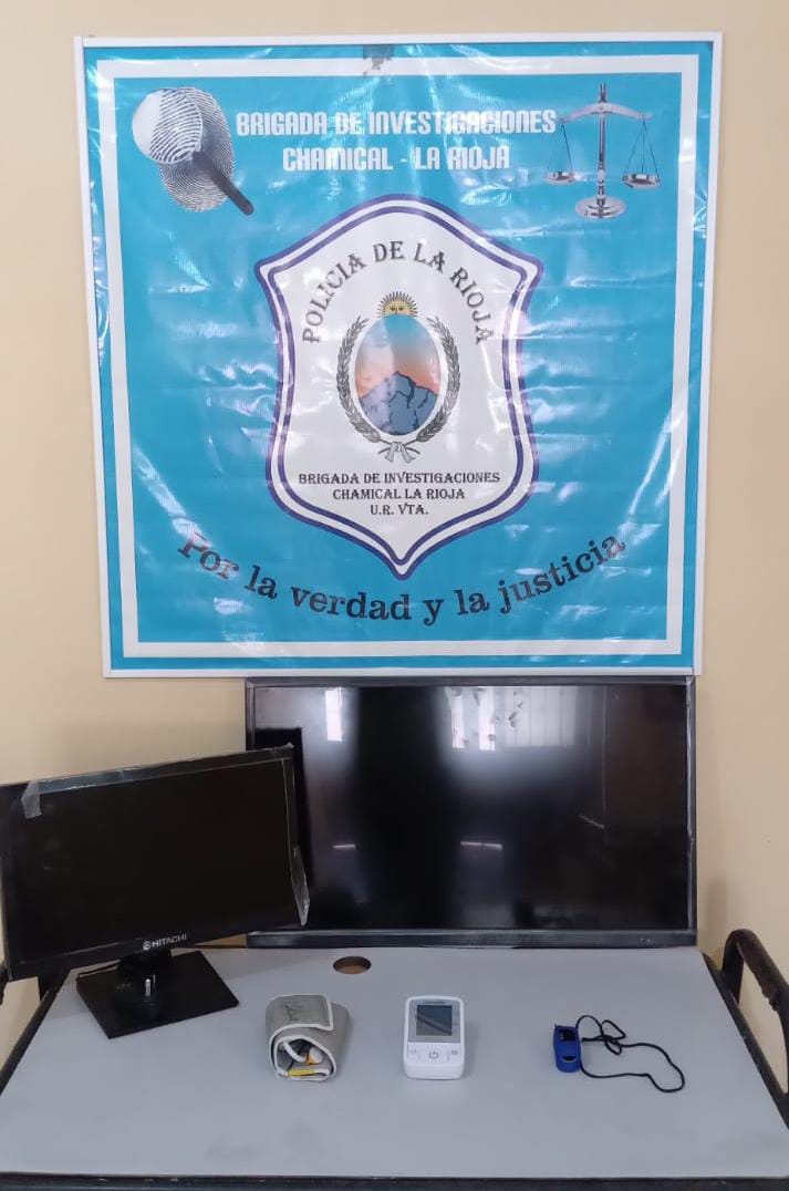 La Brigada de investigaciones informò que en la tarde de hoy se recuperaron un televisor de la Philco de color negro de 32 el cual lo hace con el faltante de cable de encendido; un monitor de computadora de 18 Hitachi de color negro; un tensiómetro digital de color gris de la marca Microlife; y un axiometro de pulso.