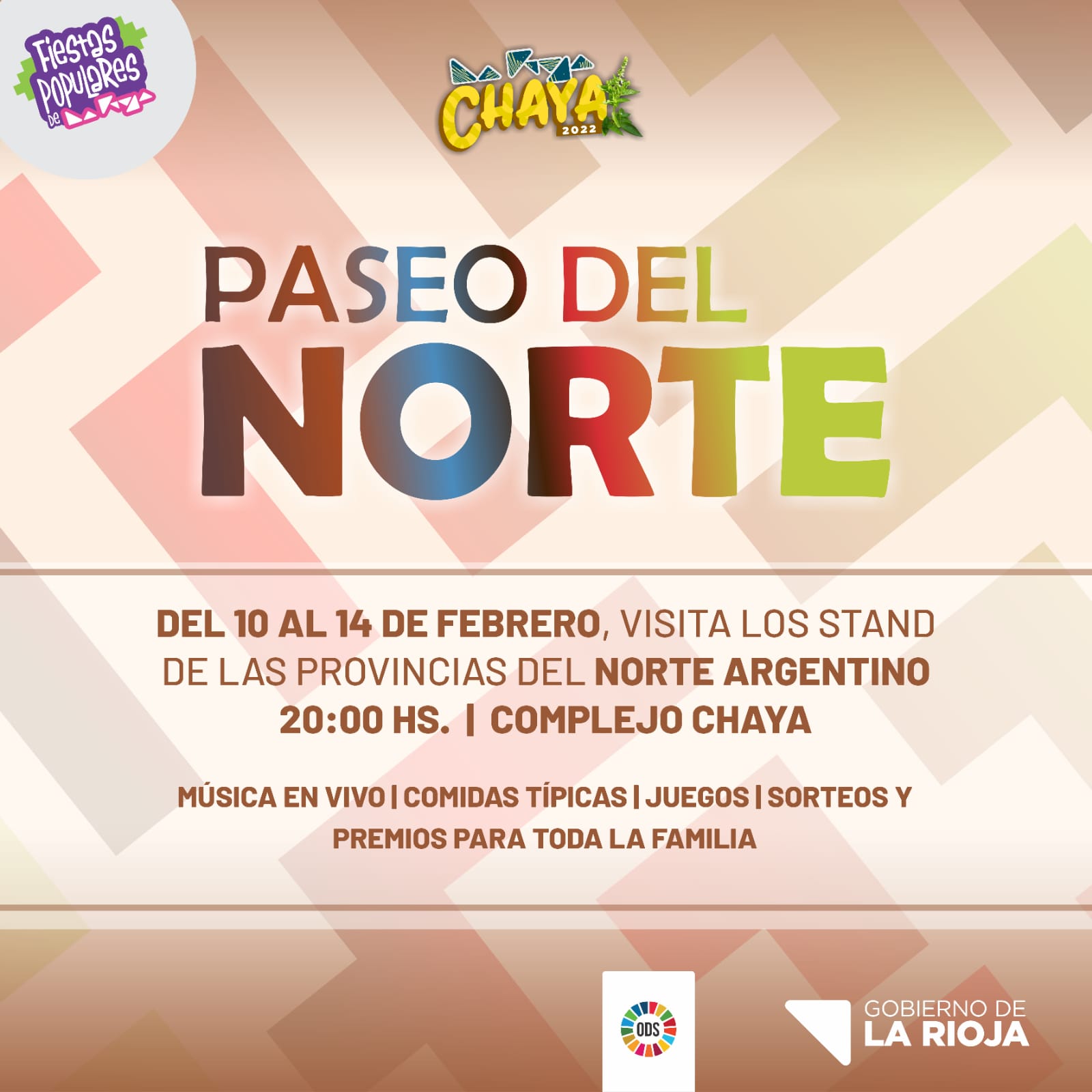 Como parte de las actividades organizadas en el marco de Fiestas Populares, el Gobierno de la Provincia de La Rioja invita a participar partir de las 20 horas de shows en vivo y a recorrer los distintos stand en el Paseo del Norte, ubicado en Complejo Chaya frente al Autódromo Ciudad de La Rioja.