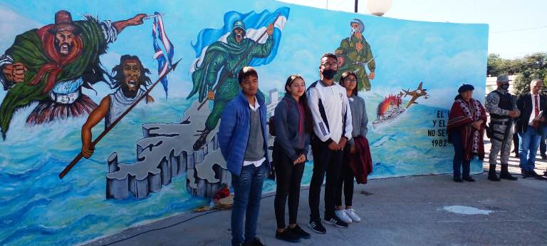 Los profesores Rolando Nieto y Andrea Mercado dirigieron y acompañaron el trabajo de los ocho alumnos del 4to año de la modalidad Artes Visuales, quienes con mucho énfasis y vocación plasmaron en la pared que rodea el pedestal del mástil donde se erige el monumento a la bandera en la cabecera departamental un mural, siguiendo la línea histórica de las Islas Malvinas desde la época colonial hasta nuestros días.