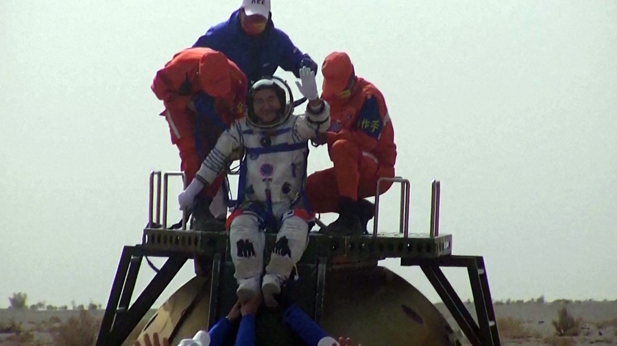 Unos 45 minutos después de aterrizar, Zhai, el comandante de la misión, abandonó la cápsula y fue colocado de inmediato en una silla especial y tapado con una manta, mientras saludaba y sonreía a las cámaras.