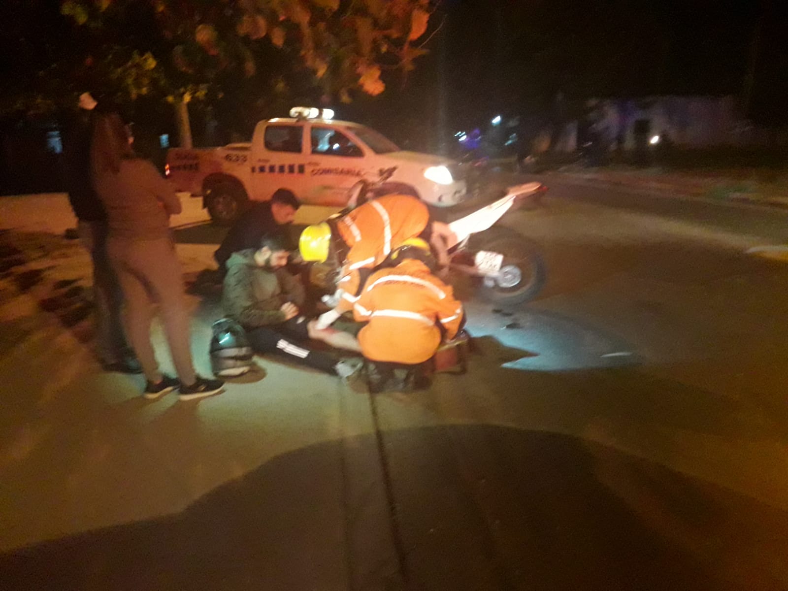 Por otra parte, en la Av. Almonacid, esquina Proyectada, los Bomberos Voluntarios, asistieron al ciudadano Federico Flores (32), quién iba al mando de una motocicleta marca Corven TRK 250 cc y por razones a establecer termina colisionando con un perro, perdiendo el control del rodado para posterior terminar cayendo pesadamente a la cinta asfáltica, sufriendo traumatismo de miembro inferior izquierdo a la altura de la rodilla con un corte de consideración, y escoriaciones en miembro superior izquierdo a la altura de la mano.