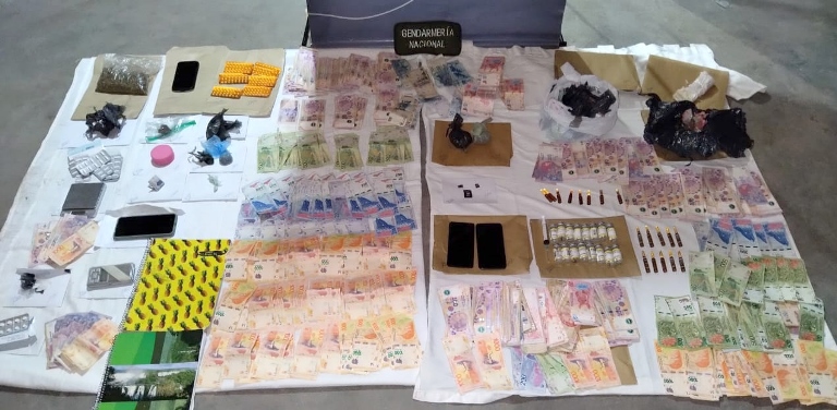 Los gendarmes procedieron a inspeccionar dos inmuebles y secuestraron: 406 gramos de marihuana, dos gramos de cocaína, semillas de cannabis sativa; 205.830 pesos; 10 ampollas de morfina y ocho de adrenalina; 16 frascos de ketamina; blísters con 246 comprimidos de medicamentos (Lorazepan, Clonozepan, Alplax); dos balanzas de precisión, ocho dispositivos móviles, tarjetas de almacenamiento de información, y documentación de interés.