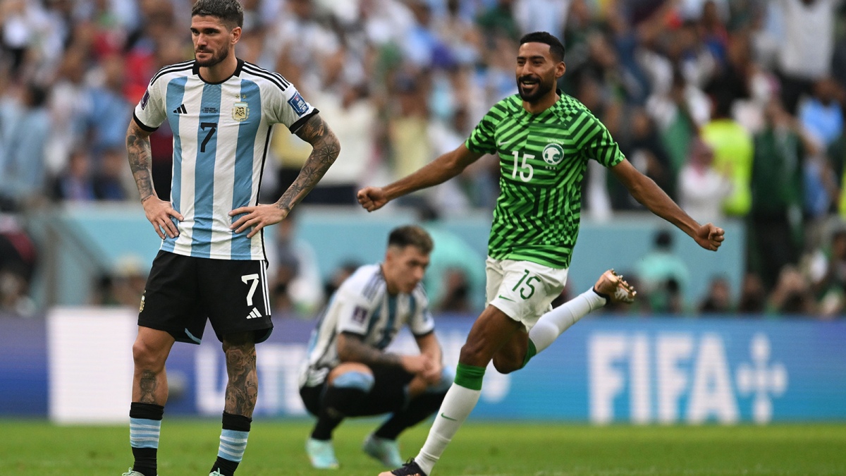 En el segundo hubo una floja reacción compartida entre Nahuel Molina, Ángel Di María y Rodrigo De Paul, quienes rodearon al "10" de Arabia Saudita pero no pudieron quitarle la pelota en el tramo que tuvo entre que bajó la pelota, se acomodó y sacó el remate que se metió en el ángulo superior izquierdo de Emiliano Martínez.