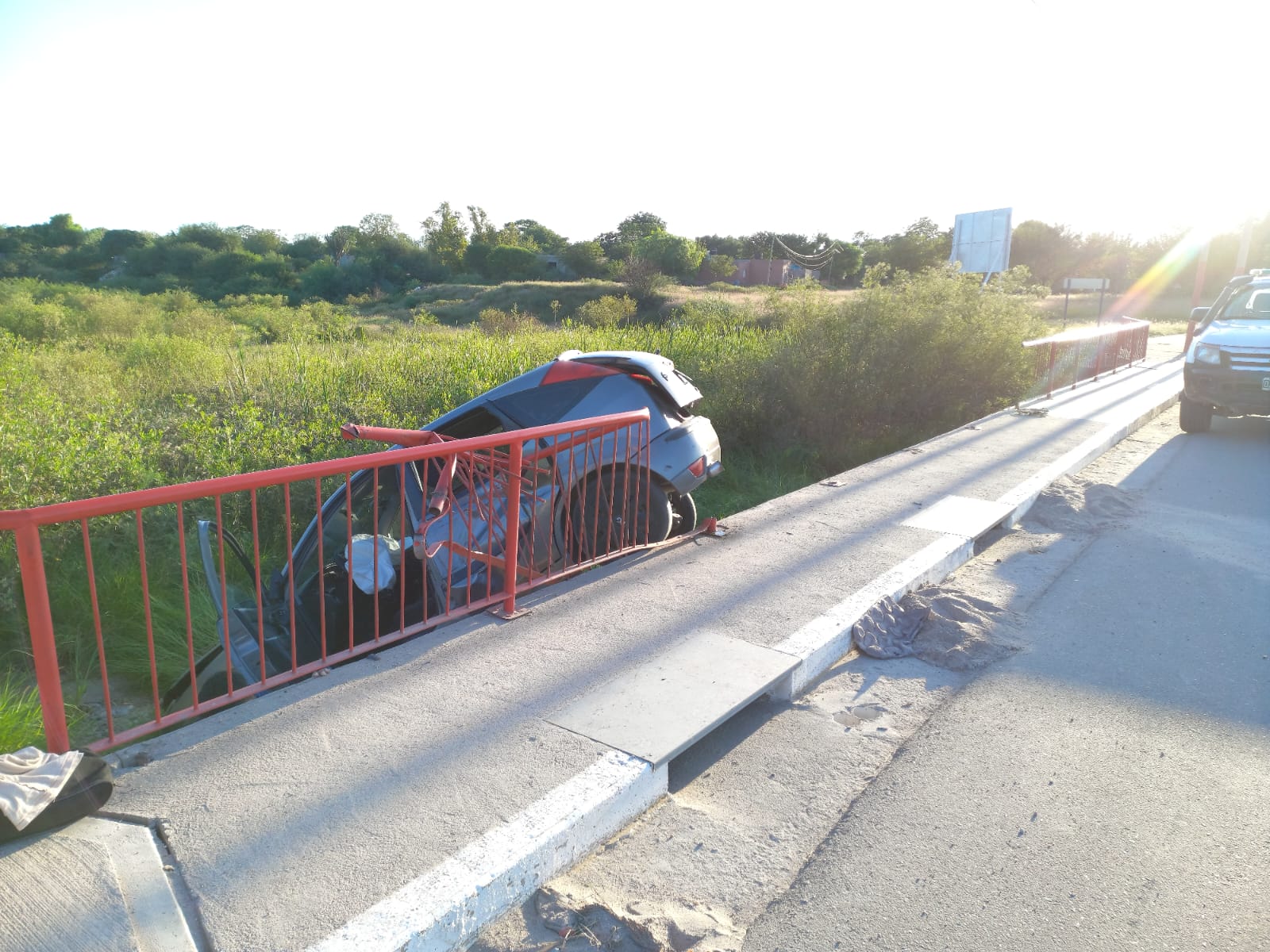 Personal de Bomberos Voluntarios y de la Policía al llegar al lugar del siniestro de tránsito, encontraron al vehículo, un Ford Focus color gris oscuro, conducido por Palacios Aaron (22años), que por razones que se desconocen perdió el control y cayó desde el puente, quedando colgado de su parte trasera.