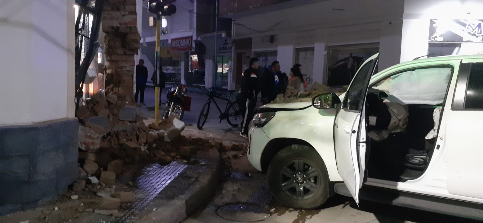 CHILECITO (De nuestra agencia) El siniestro se produjo en pleno centro entre una camioneta Toyota Hilux y una Eco Sport. El vehículo de mayor porte terminó incrustado en la puerta de ingreso de un negocio, rompiendo todo el frente del mismo.