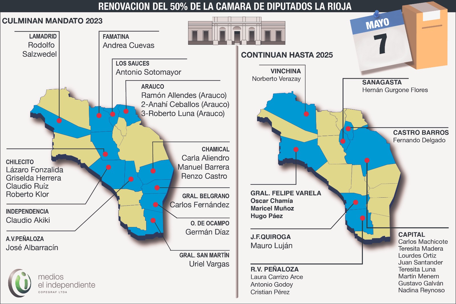 Terminan su mandato por el departamento Arauco (Aimogasta), Ramón Allendes, Anahí Ceballos y Roberto Luna. En Chamical, lo culminan Carla Aliendro, Manuel Barrera y Renzo Castro; en Chilecito, Lázaro Fonzalida, Griselda Herrera, Roberto Klor (Juntos por el Cambio-Vamos La Rioja) y Claudio Ruiz. En Famatina, Andrea Cuevas, el caso mencionado más arriba. En Angel Vicente Peñaloza (Tama), finaliza el mandato José Albarracín quien estuvo por dos periodos en la Cámara y ahora se candidatea para intendente. En Belgrano (Olta) Carlos Fernández; en Lamadrid (Villa Castelli) Rodolfo Salzwedel y en Ortiz de Ocampo (Milagro) Germán Díaz. Todos del justicialismo salvo Klor de Chilecito.