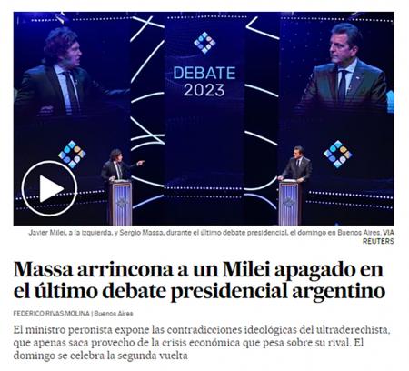 El diario español se sumó a los principales medios del mundo que publicaron en sus plataformas sobre la jornada de debate, destacando el desempeño de Sergio Massa y calificando de "nervioso" a Milei.