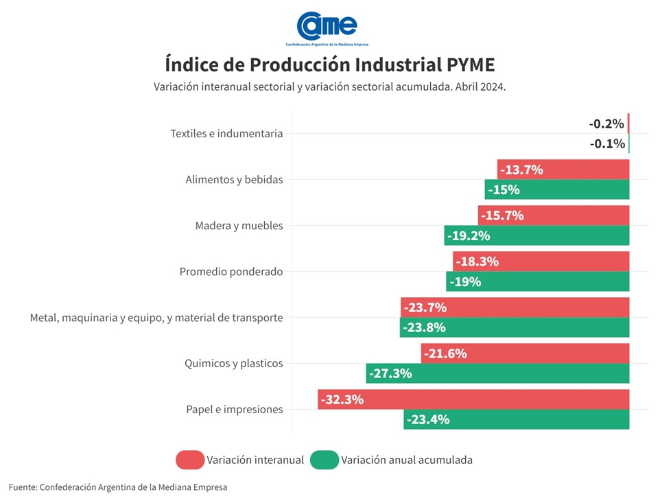Los seis sectores manufactureros del segmento pyme tuvieron caídas en la comparación anual en abril, siendo los más afectados “Papel e Impresiones” (-32,3%) y “Metal, maquinaria, equipos y material de transporte” (-23,7%).