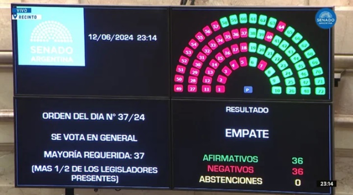 Pasadas las 23, con el discurso final del senador libertario Atauche, se procedió a dar paso a la votación en general que resultó 36 a 36. Siguiendo el artículo 213 del reglamento del Senado en caso de empate se somete a una segunda votación y en caso de continuar la misma situación, la vicepresidenta procede a desempatar.