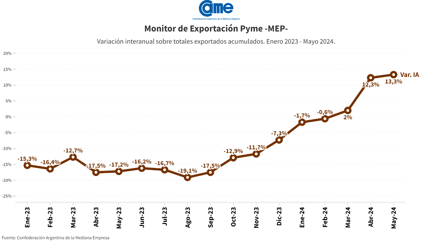 Así surge del Monitor de Exportación Pyme (MEP), un indicador elaborado por el sector de Estadísticas e Informes de la Confederación Argentina de la Mediana Empresa (CAME), para medir las exportaciones de las pequeñas y medianas empresas de la República Argentina. La medición es en base al monitoreo mensual de las operaciones de las empresas argentinas en el comercio exterior, discriminando por su condición pyme declarada ante la Secretaría de la Pequeña y Mediana Empresa, Emprendedores y Economía del Conocimiento, dependiente del Ministerio de Economía de la Nación.