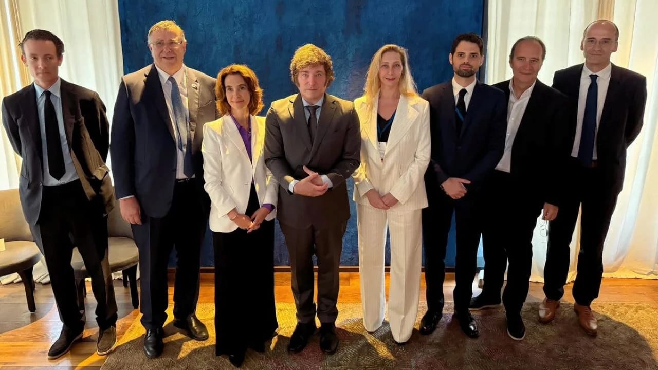 En la foto que difundió el vocero presidencial, Manuel Adorni, a través de sus redes sociales, se lo ve a Milei junto a los cinco titulares de firmas luego de una hora de intercambio en la embajada ubicada en la calle Cimarosa número 6, de la capital francesa.