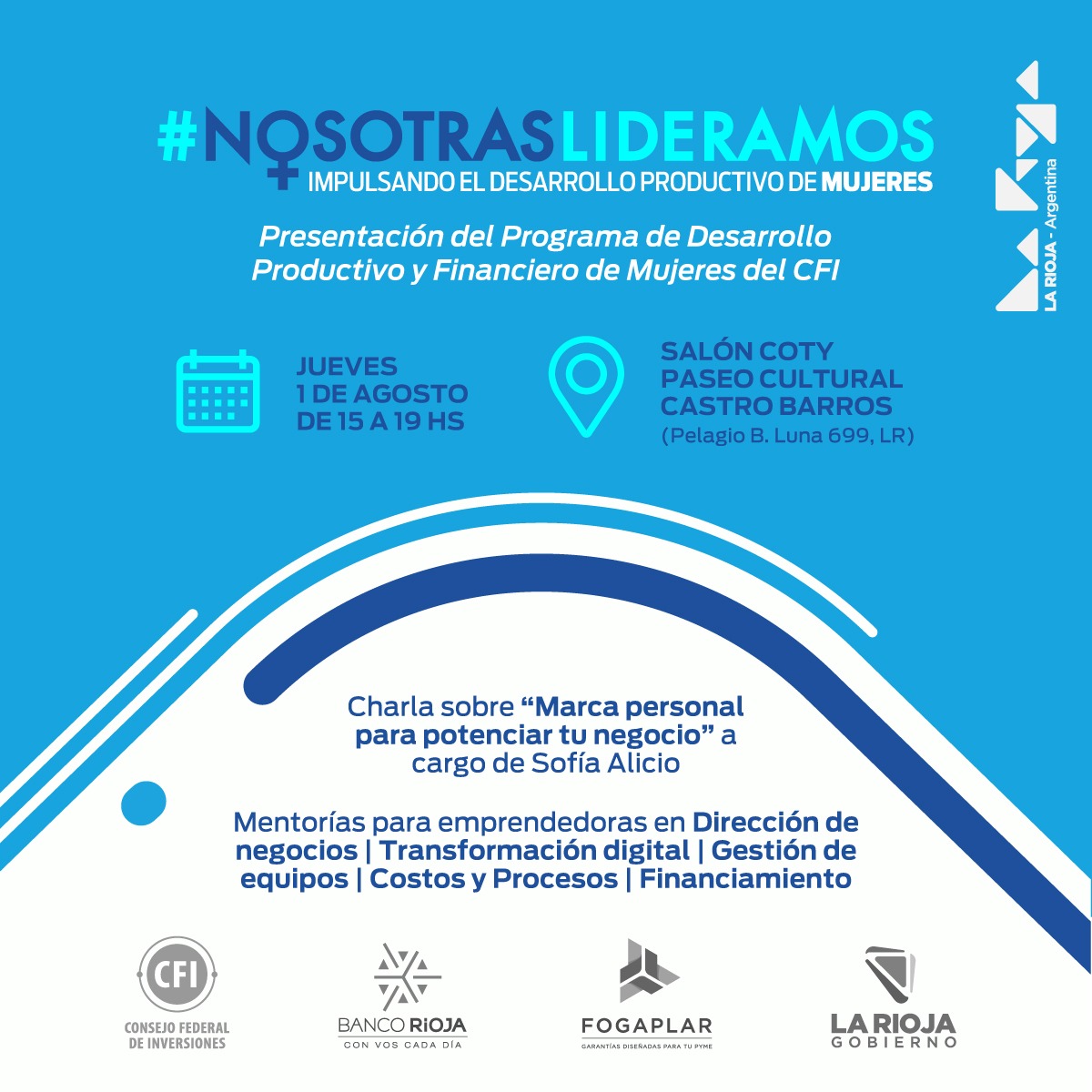 Con el propósito de impulsar el desarrollo productivo de las mujeres, el Gobierno de la Provincia de La Rioja, junto al Consejo Federal de Inversiones; Banco Rioja y FOGAPLAR invitan a participar de la nueva edición del ciclo #NosotrasLideramos, un encuentro dedicado al crecimiento y empoderamiento de las mujeres en el ámbito empresarial y emprendedor.