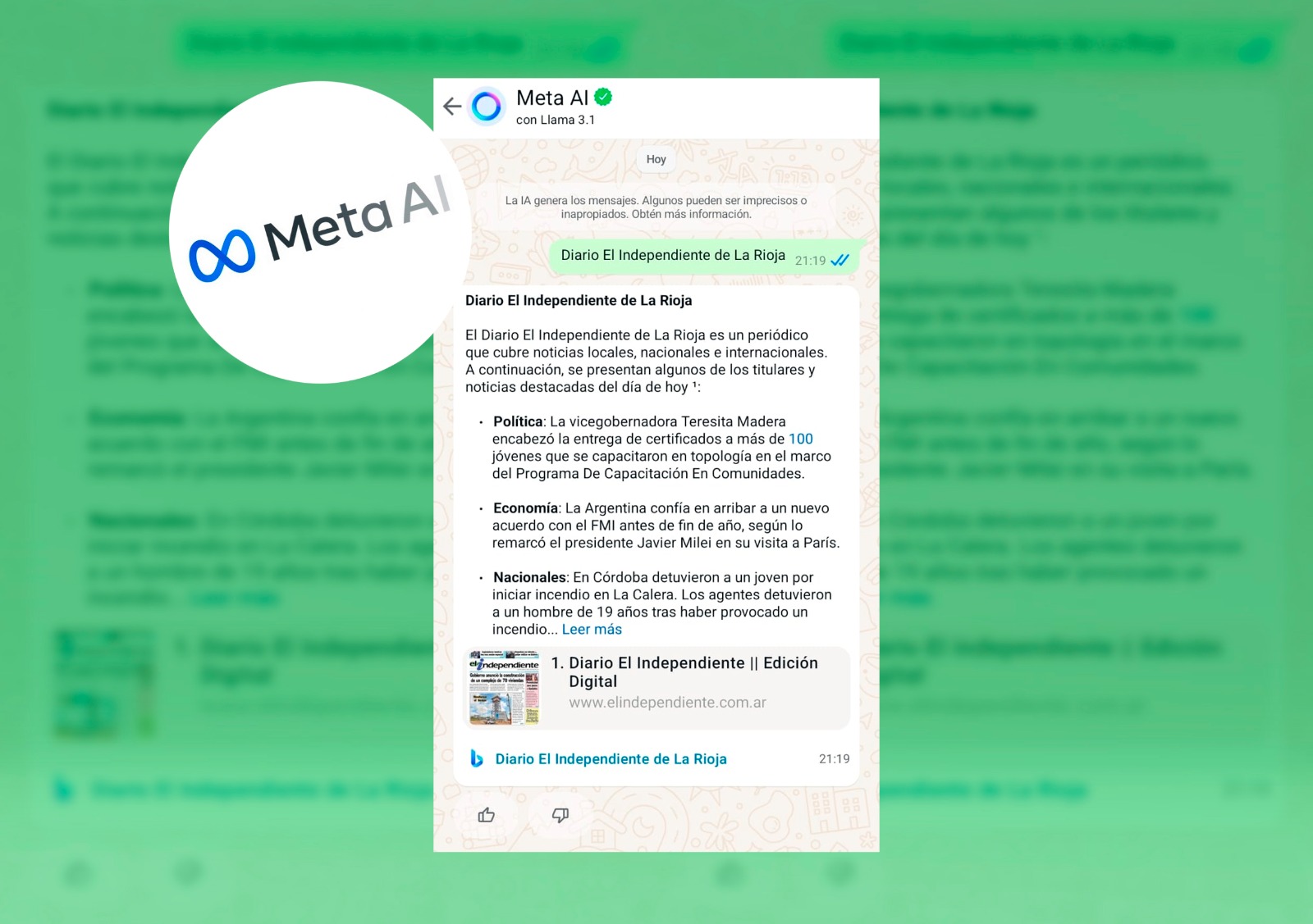 A modo de prueba, abrimos un chat en el círculo de Meta AI que aparece en WhatsApp y escribimos Diario El Independiente de La Rioja e inmediatamente nos envió como respuesta una descripción, títulos de las noticias destacadas del día y la dirección de la página web.