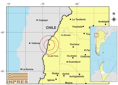 Su epicentro fue a 283 km al Oeste de La Rioja; 334 km al Norte de San Juan; 112 km al Este de Vallenar -28.650 (lat) -69.610 (long). Su magnitud de 5.6, profundidad a 139 Km.