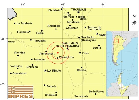Su epicentro fue a 51 km al Suroeste de San Fernando del Valle de Catamarca; 105 km al Noreste de La Rioja; 24 km al Norte de Chumbicha -28.630 (lat) -66.220 (long). Magnitud de 3.6 en la escala de Richter, profundidad de 10 Kilómetros.