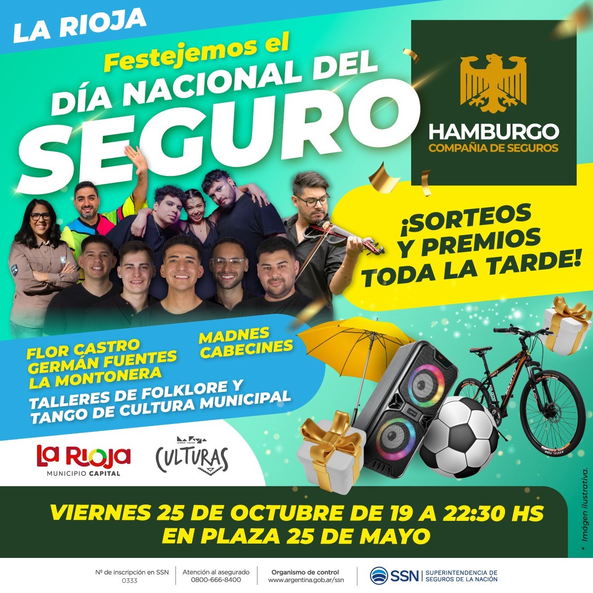 El próximo viernes 25 de octubre, desde las 19 en Plaza 25 de Mayo, se llevará a cabo el tradicional festejo por el Día del Seguro, con un espectáculo que incluirá música, danza, show infantil, numerosos sorteos y muchas sorpresas para toda la familia.
