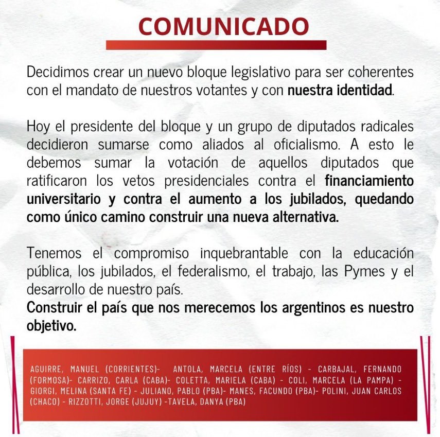 El argumento principal queda expuesto en el segundo párrafo al señalar que “hoy el presidente del bloque y un grupo de diputados radicales decidieron sumarse como aliados al oficialismo” e inmediatamente pasaron factura y recordaron que “a esto le debemos sumar la votación de aquellos diputados que ratificaron los vetos presidenciales contra el financiamiento universitario y contra el aumento a los jubilados, quedando como único camino construir una nueva alternativa”.