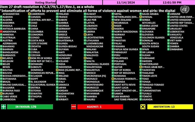En esta oportunidad, fue el único país del organismo que se opuso a una resolución para eliminar y prevenir la violencia contra las mujeres y niñas en entornos digitales. 170 países aprobaron la resolución, entre ellos Estados Unidos e Israel, con los que el Gobierno está alineado geopolíticamente. Por su parte, hubo 13 abstenciones, entre ellas las de Irán, Corea del Norte, Rusia y Nicaragua.