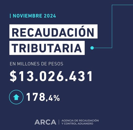 La recaudación de Recursos Tributarios alcanzó 13.026.431 millones de pesos en noviembre, con una variación interanual de 178,4%, informó hoy la Agencia de Recaudación y Control Aduanero (ARCA).