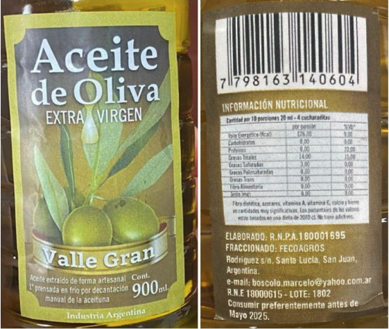 ANMAT advierte sobre unidades falsificadas de aceite de oliva virgen extra de las marcas Olivos San Cayetano y Valle Gran.