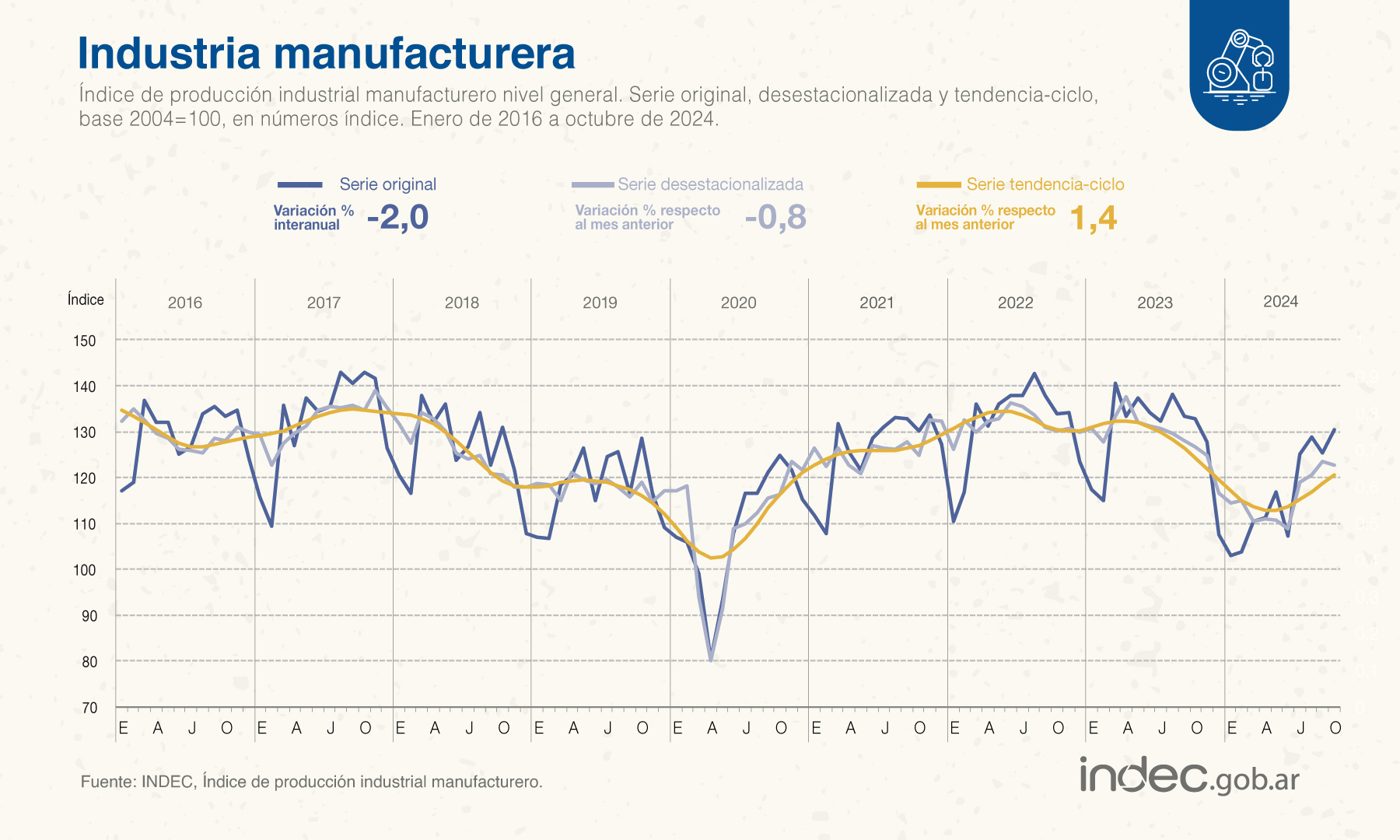 En octubre de 2024, el índice de producción industrial manufacturero (IPI manufacturero) muestra una caída de 2,0% respecto a igual mes de 2023. El acumulado de enero-octubre de 2024 presenta una disminución de 11,6% respecto a igual período de 2023.