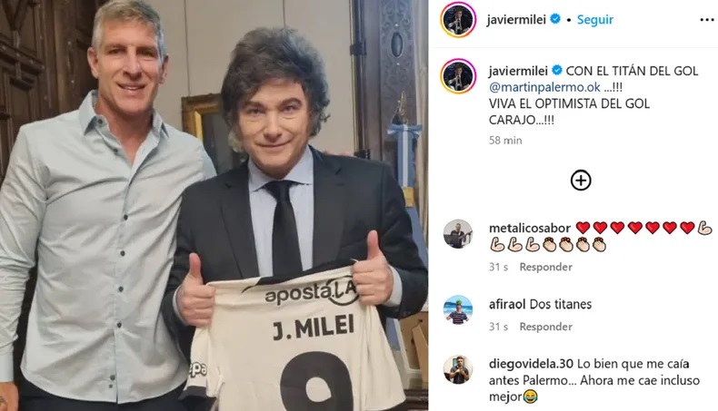 El presidente Javier Milei recibió la visita de Martín Palermo en el marco de un viaje del máximo goleador histórico de Boca a la Argentina en sus vacaciones, luego de que el equipo que entrena, Olimpia, se consagrara campeón en Paraguay. Luego, ambos saludaron en el balcón de la Casa Rosada.