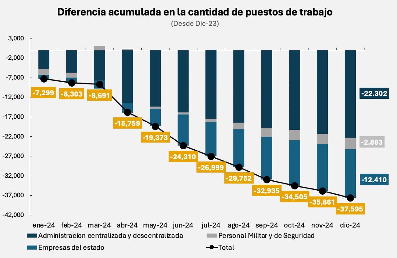 En la publicación, el economista indicó que hubo 37.595 empleados públicos desvinculados en el primer año de gestión de La Libertad Avanza. Según afirma en un gráfico, estos datos están tomados hasta diciembre de 2024.