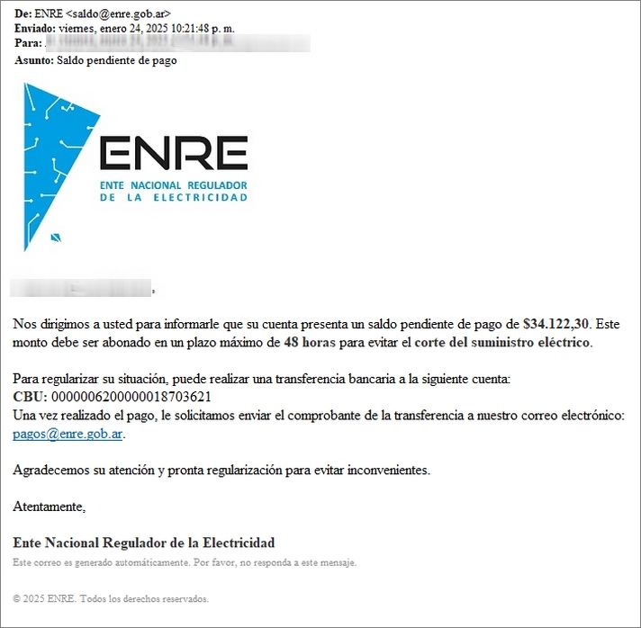 El ENRE advierte sobre la circulación de correos electrónicos que informan al destinatario sobre una deuda presuntamente contraída con la prestadora del servicio eléctrico. La comunicación incluye los datos de una cuenta bancaria donde el usuario "moroso" debe transferir el monto imputado si no quiere sufrir un corte de suministro por falta de pago