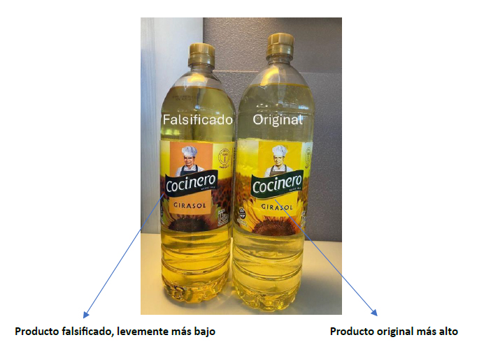 La botella del producto genuino es levemente más alta que la del producto falsificado.